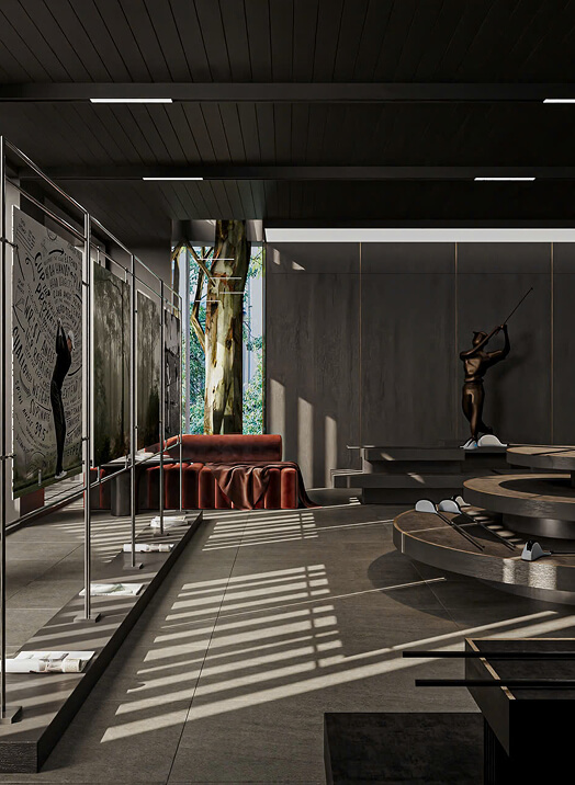 Lấy cảm hứng từ nghệ thuật trưng bày đương đại kết hợp với các chất liệu truyền thống, tạo nên một không gian trưng bày độc bản.